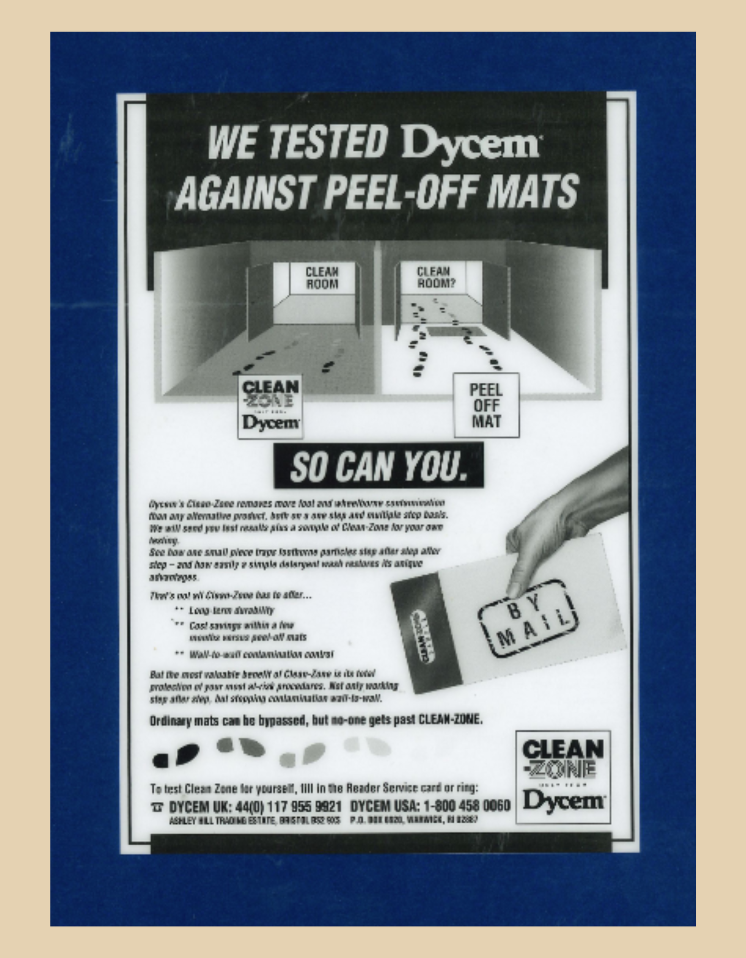 Founded in 1966, Dycem later expanded into contamination control applications after a workplace use case demonstrated how the material could remove contaminants from footwear and transfer them to the surface. In 1978, Dycem pioneered an early contamination control, supporting the evolution of reusable contamination control mats used across modern facilities.